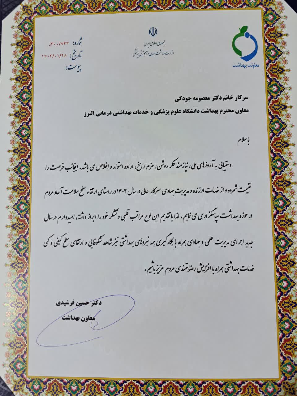 در حاشیه این اجلاس از خانم دکتر جودکی معاون بهداشت دانشگاه علوم پزشکی البرز تقدیر شد.