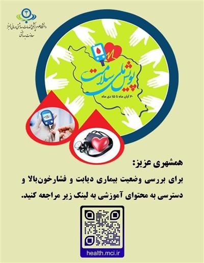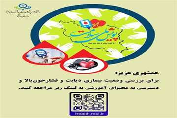 هموطن عزیز نظام بهداشتی كشور با هدف كنترل و كاهش بیماری پرفشاری خون و دیابت برای اشخاص ۱۸سال و بالاتر، شما را به این پویش همگانی دعوت می‌كند.