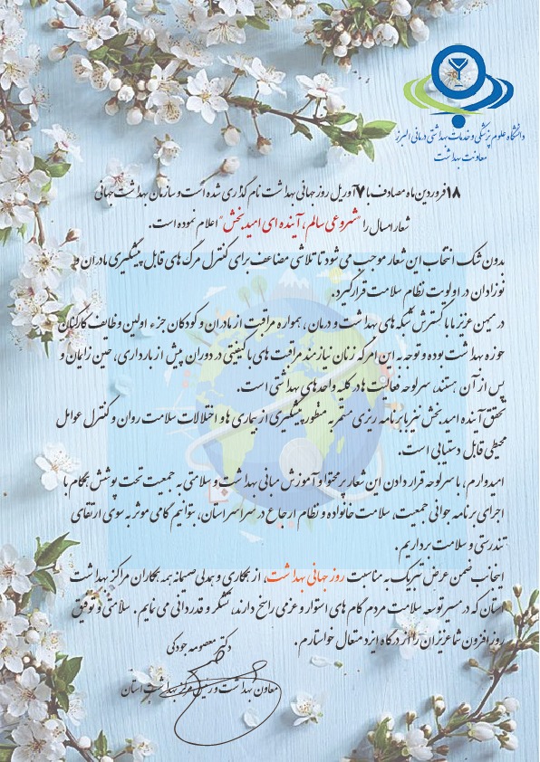 پیام تبریک معاون بهداشت به مناسبت روز جهانی بهداشت گروه خبری : اخبار,اخبار و اطلاعیه ها کد خبر : 340087 کلمات کلیدی