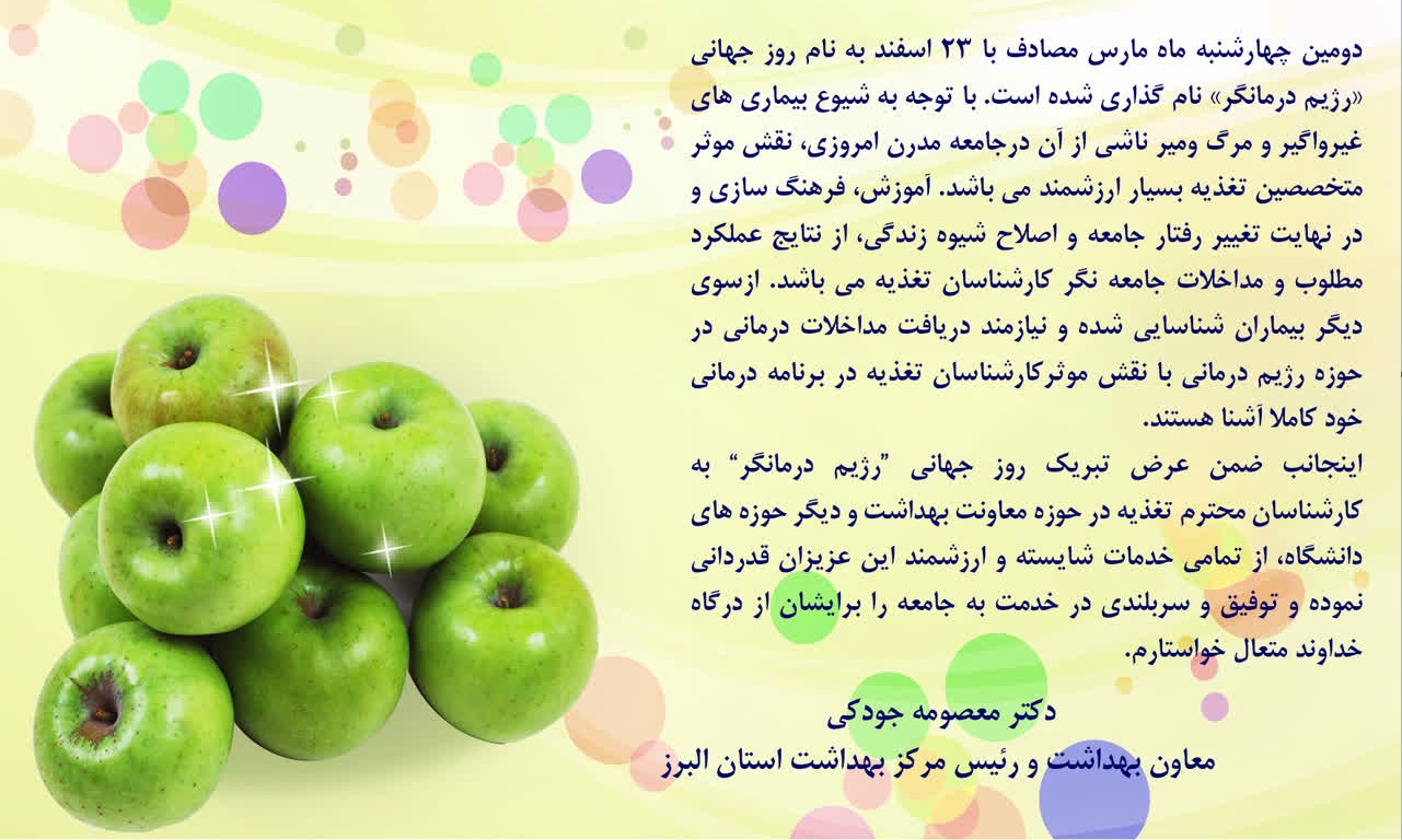 پیام تبریک معاون بهداشت به مناسبت روز جهانی رژیم درمانگر