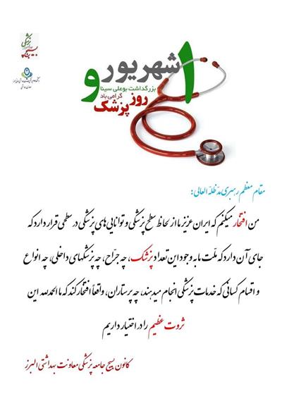 یکم شهریور، زادروز حکیم ابوعلی سینا و روز پزشک، روز جاری شدن عاطفه‌ ها، روز درخشیدن ایمان در قلب‌ های مهربان و روز افتخار انسان به انسانیّت گرامی باد