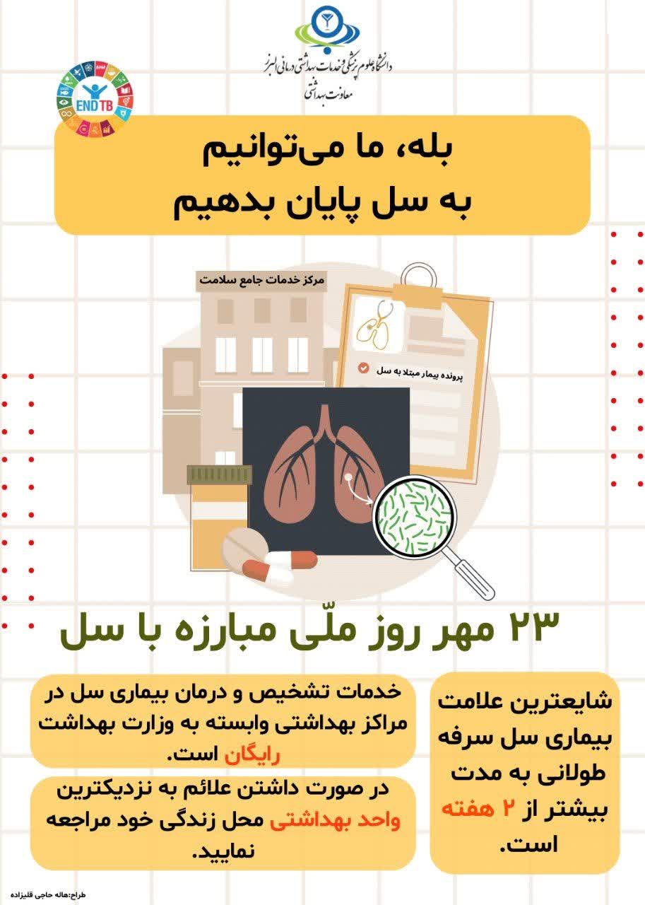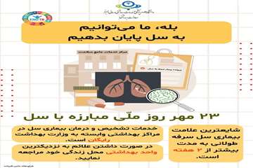 امروزه یکی از بزرگترین مشکلات بهداشتی جهان، بیماری سل می باشد. برآورد میشود که از هر سه نفر جمعیت جهان، یک نفر به باسیل سل آلوده باشد و در هر ثانیه نیز یک نفر به تعداد آنان افزوده می شود. مطالعات نشان داده است که هر بیمار مبتلا به سل ریوی خلط مثبت درمان نشده تا زمان مرگ یا بهبود خود به خودی، سالانه بطور متوسط 10 تا 15 نفر را آلوده کرده و از این تعداد نیز 5 تا 10% در زمانی از طول عمر خود به بیماری سل فعال مبتلا شده و خود نقش یک مخزن جدید را برای انتشار بیماری ایفا می کنند. سل یک بیماری عفونی حاد تنفسی است که توسط ریز قطرات تنفسی فرد بیمار به فرد سالم منتقل میشود به دلیل اینکه راه انتقال بیماری به صورت تنفسی می باشد ، پیشگیری و درمان افراد مبتلا به سل مسری به عنوان مخازن بیماری (سل ریوی اسمیر مثبت (بیشترین و مهمترین) / سل ریوی اسمیر منفی که در گرافی قفسه سینه آنها حفره مشاهده شود / سل خارج ریوی حنجره) در کنترل بیماری در جامعه دارای اهمیت فوق العاده ای است شایعترین علامت ابتلا به بیماری سل ریوی : سرفه پایدار به مدت 2 هفته یا بیشتر، که معمولا با خلط و گاهی خلط خونی همراه بوده و ممکن است تنگی نفس و درد قفسینه نیز وجود داشته باشد علایم عمومی: تب، کاهش اشتها، کاهش وزن، بی حالی، تعریق شبانه، خستگی زودرس و ضعف عمومی علایم سل خارج ریوی : به عضو مبتلا بستگی دارد خدمات مربوط به آموزش، پیگیری، تشخیص و درمان بیماری سل در کلیه مراکز خدمات جامع سلامت به صورت رایگان، محرمانه و تخصصی ارائه می گردد.