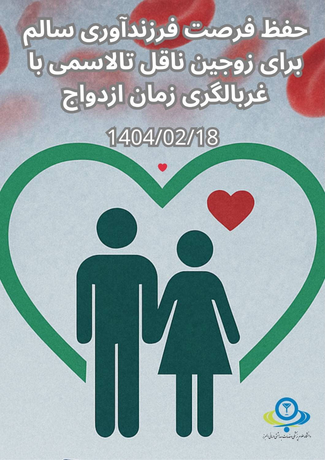 8 می مصادف با 18 اردیبهشت هر سال به نام روز جهانی تالاسمی نام گذاری شده است . شعار ملی این روز در سال 1404 " حفظ فرصت فرزند آوری سالم برای زوجین ناقل تالاسمی با غربالگری زمان ازدواج" می باشد . تالاسمی (Thalassemia) یکی از انواع کم‌خونی است که در زمره بیماری‌های ارثی قرار دارد که در آن مقدار هموگلوبین خون به کمتر از سطح طبیعی کاهش می‌یابد. هموگلوبین یکی از پروتئین‌های بسیار کلیدی در حمل اکسیژن است و هرگونه نقص و اختلال در عملکرد آن به‌صورت علائم کم خونی خود را نشان می‌دهد. ضعف، خستگی، کندی رشد، تورم غیر طبیعی، صورت رنگ پریده، ساختار غیر طبیعی استخوان؛ به ویژه در ناحیه صورت و جمجمه، مشکلات قلبی و تجمع آهن در خون، مهمترین علایم این بیماری محسوب می شوند. علایم تالاسمی در برخی نوزادان کاملا مشهود است؛ در حالی که در برخی دیگر این علایم به مرور زمان در دوسال اول زندگی دیده می شود. بیماران مبتلا به تالاسمی شدید (ماژور)، نیازمند درمان هایی مانند پیوند مغز استخوان و دریافت خون هستند مهمترین روش برای جلوگیری از تولد نوزاد مبتلا به تالاسمی، غربالگری های هنگام ازدواج می باشد که با دقت بالایی احتمال تولد نوزاد مبتلا را پیش بینی می کند.